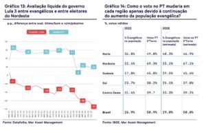“Em 2022, 70% dos evangélicos votaram contra Lula. Em 2025, o padrão permanece — e esse eleitorado continua crescendo, inclusive no Nordeste, antes reduto petista. Essa mudança demográfica corrói o apoio histórico da região”, avaliou.