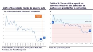 8. A Mar Asset transformou dados de aprovação em intenção de voto. Usando séries históricas que correlacionam aprovação e desempenho em eleições, o resultado foi esse: Lula teria hoje entre 38% e 45% dos votos válidos num 2º turno. Ou seja, não venceria. E a tendência é de piora, não de recuperação.