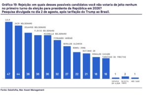 Outro alerta vem dos números: projeções da Mar Asset, cruzando índices de aprovação com históricos eleitorais, apontam que Lula teria hoje entre 38% e 45% dos votos válidos em um segundo turno, percentual insuficiente para garantir a vitória.