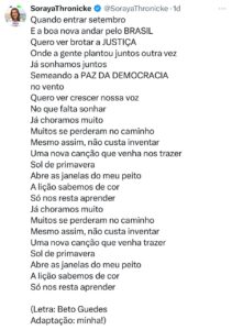 Soraya, no entanto, ironizou o início do julgamento com uma paródia da música Sol de Primavera, de Beto Guedes, e chegou a discutir com seguidores que a lembraram de ter sido eleita com o slogan “a senadora de Bolsonaro”, antes de romper com o ex-presidente no ano seguinte às eleições.