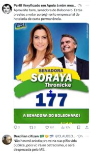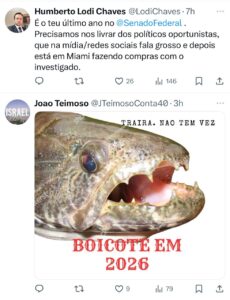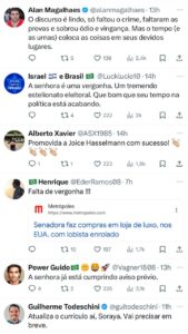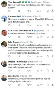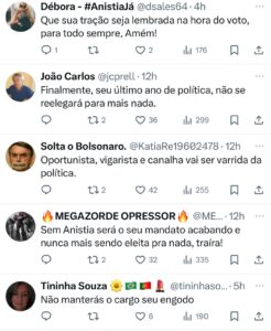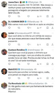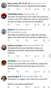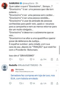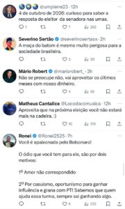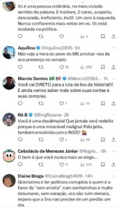 A reação dos seguidores foi imediata e intensa. A maioria apontou que “gravíssimo”, na visão deles, foi a senadora ter sido vista ao lado de um homem acusado de chantagear empresas de apostas para evitar convocações à CPI das Bets, comissão que, coincidentemente, foi relatada por Soraya Thronicke.