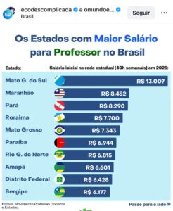 Na educação, lidera o ranking nacional de remuneração docente em 2025, com piso de R$ 13.007