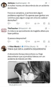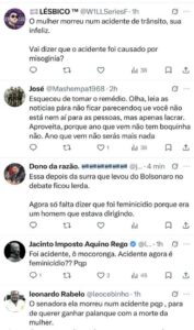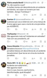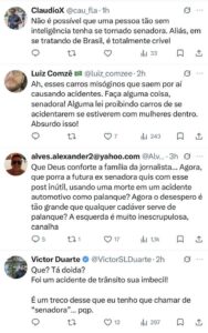 Júlio Pimenta escreveu: “Senadora, a jornalista morreu em um acidente de trânsito. Não vai começar a falar que acidente foi em decorrência dela ser mulher, não vai começar a falar de misoginia em um momento desse”.