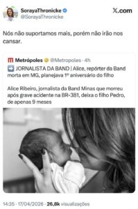 A publicação feita pela senadora Soraya Thronicke (PSB) nesta sexta-feira (17) na rede social X sobre a jornalista Alice Ribeiro, da Band em Minas Gerais, que morreu em um grave acidente na BR-381 na última quinta-feira (16), levou seguidores a questionarem o teor da mensagem.
